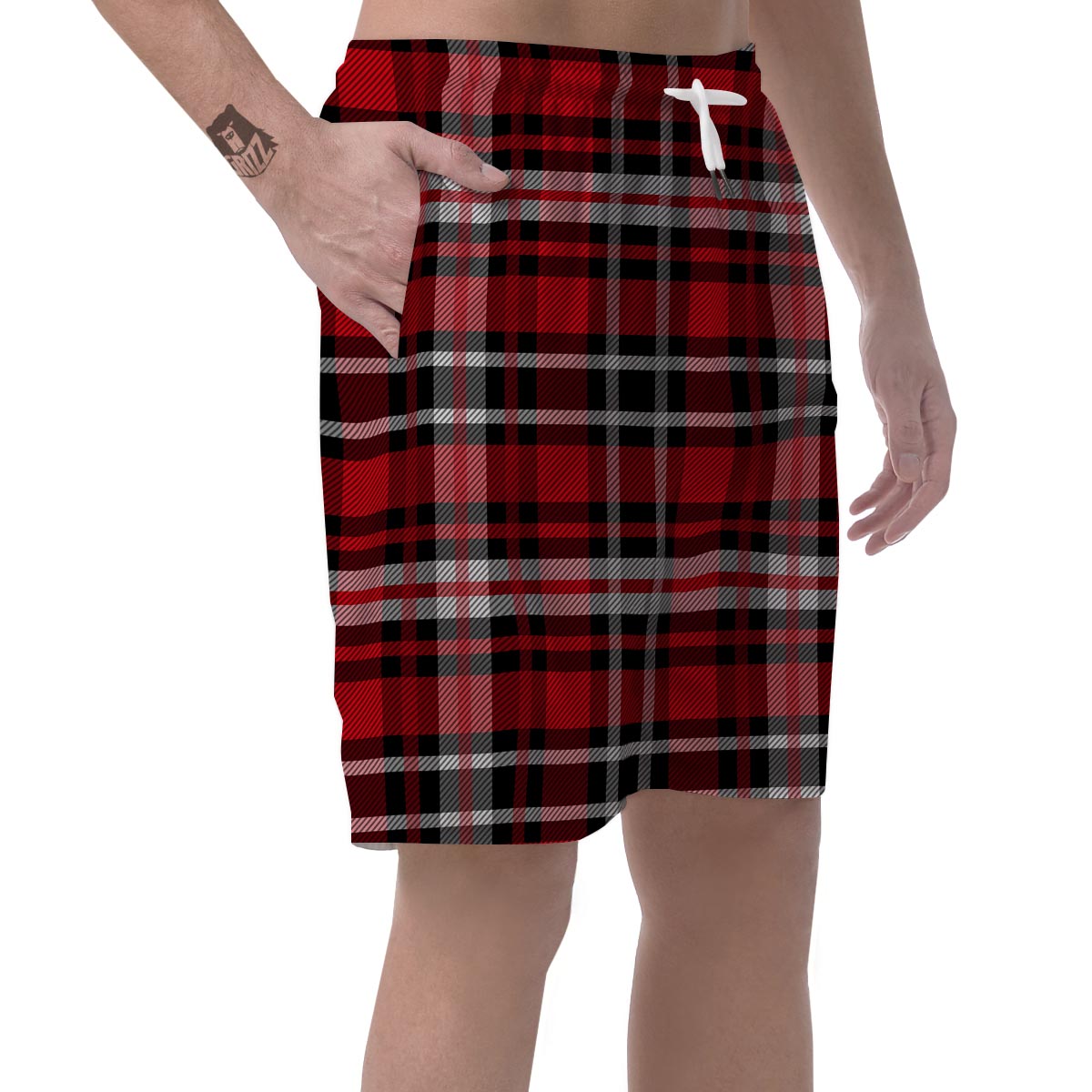 Red Plaid Tartan Print Mens Beach Short